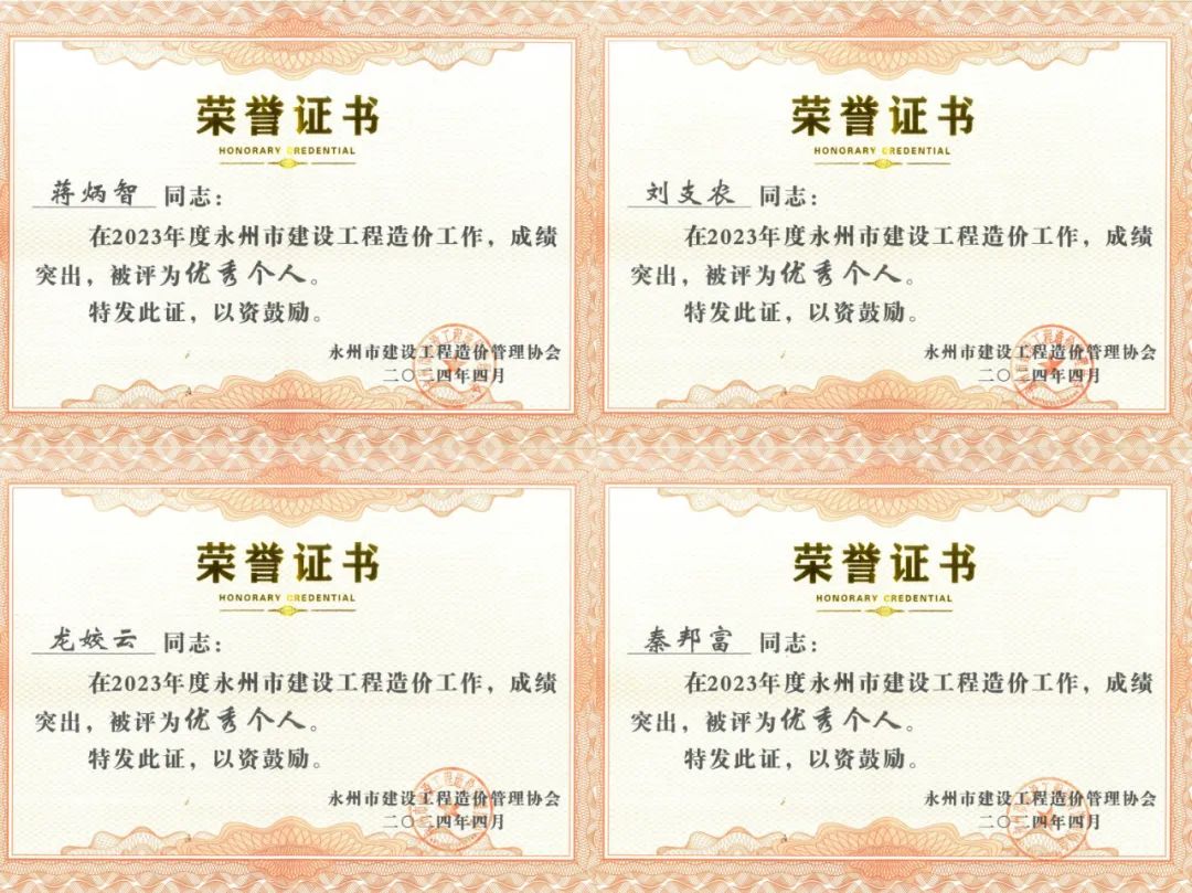 ????在剛剛結(jié)束的2023年度永州市建設工程造價工作中,我公司四位杰出的同事——龍姣云、蔣炳智、泰邦富和劉支農(nóng),憑借在各自崗位上的出色表現(xiàn),榮獲“2023年度優(yōu)秀個人會員”。